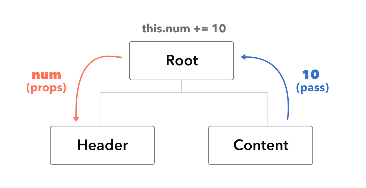 <div id="app"> <app-header v-bind:propsdata="num"></app-header> <app-content v-on:pass="deliverNum"></app-content> </div> <script> var appHeader = { template: '<div>Header <p>{{ propsdata }}</p></div>', props: ['propsdata'], }; var appContent = { template: '<div>Content <button v-on:click="passNum">Pass</button> </div>', methods: { passNum: function () { this.$emit('pass', 10); }, }, }; var vm = new Vue({ el: '#app', components: { 'app-header': appHeader, 'app-content': appContent, }, data: { num: 0, }, methods: { deliverNum: function (value) { this.num += value; }, }, }); </script>흐름을 풀어서 설명하면 이렇습니다.
