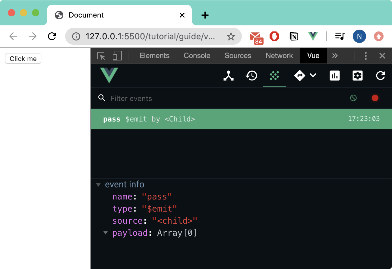 <div id="app"> <child v-on:pass="logText"></child> </div> <script> var child = { template: '<button v-on:click="passEvent">Click me</button>', methods: { passEvent: function () { this.$emit('pass'); } } } new Vue({ el: '#app', components: { 'child': child }, methods: { logText: function () { console.log('클릭!'); } } }) </script>그럼 아래 흐름에 의해 콘솔에 문자가 찍히게 됩니다.