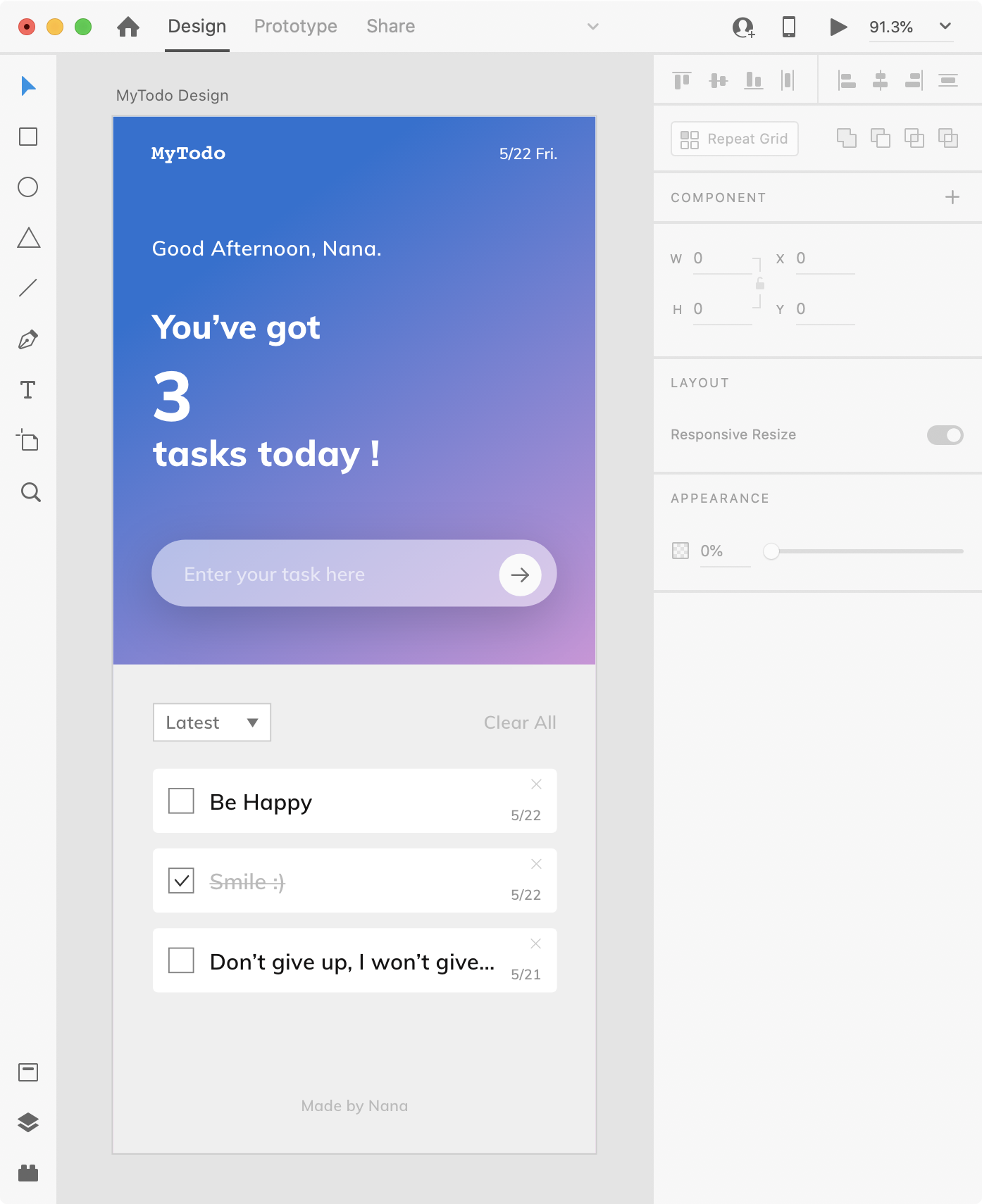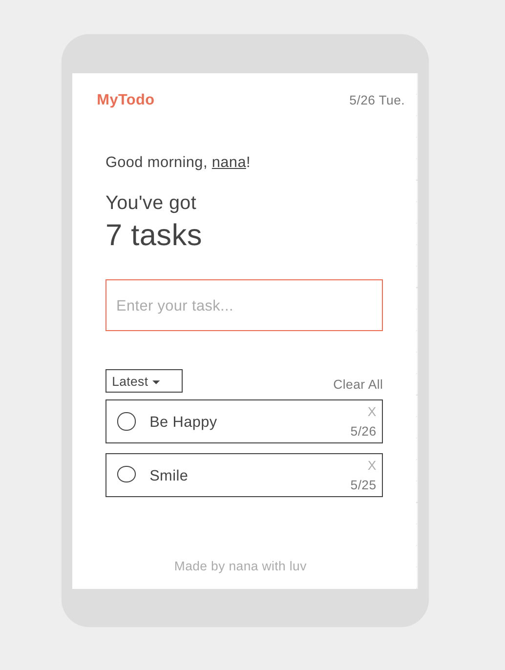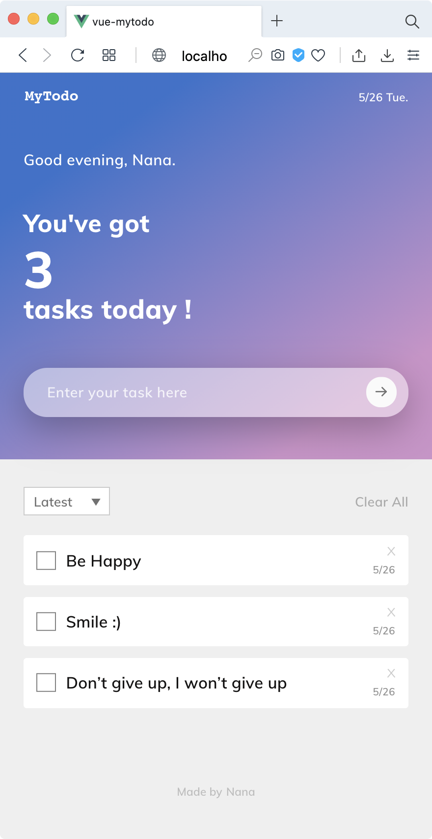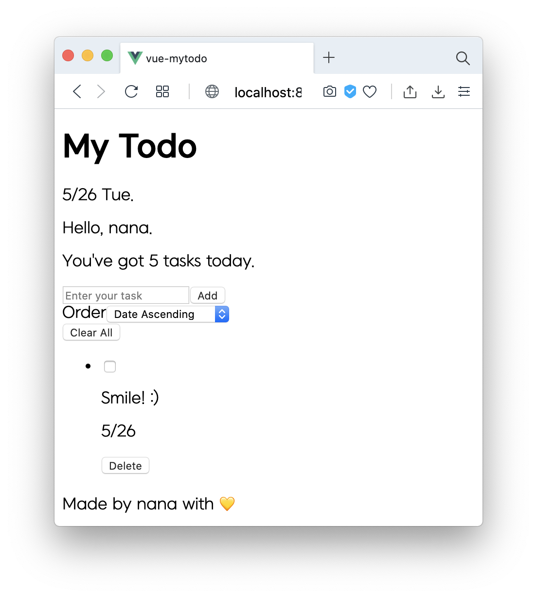 <!-- TodoInput.vue --> <template> <div class="add"> <input type="text" class="add__input" placeholder="Enter your task" /> <button class="add__button">Add</button> </div> </template><!-- TodoController.vue --> <template> <div class="controller"> <div class="select"> <label for="order">Order</label> <select name="order" id="order" class="selectbox"> <option value="date-asc">Date Ascending</option> <option value="date-desc">Date Descending</option> <option value="name-asc">Name Ascending</option> <option value="name-desc">Name Descending</option> </select> </div> <button class="clear">Clear All</button> </div> </template><!-- TodoFooter.vue --> <template> <footer class="footer">Made by nana with 💛</footer> </template>마크업이 중요한 작업이 아니므로 빠르게 진행했습니다.