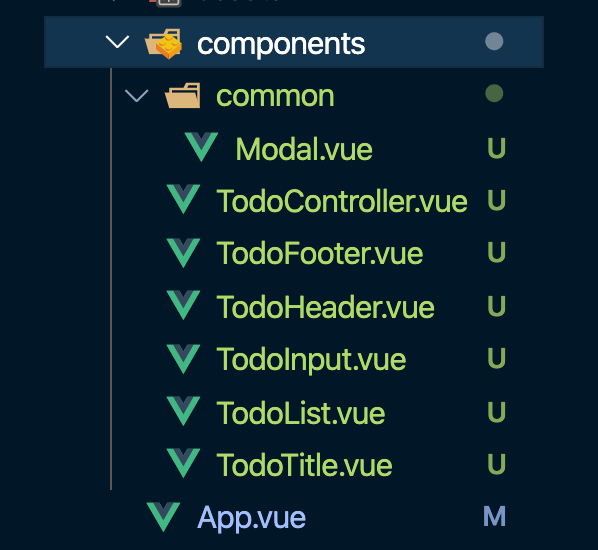 components: { }아래에 하나씩 넣어줍니다.<!-- App.vue --> <template> <div id="app"> <TodoHeader /> <TodoTitle /> <TodoInput /> <TodoController /> <TodoList /> <TodoFooter /> </div> </template> <script> import TodoHeader from "./components/TodoHeader"; import TodoTitle from "./components/TodoTitle"; import TodoInput from "./components/TodoInput"; import TodoController from "./components/TodoController"; import TodoList from "./components/TodoList"; import TodoFooter from "./components/TodoFooter"; export default { name: "App", components: { TodoHeader, TodoTitle, TodoInput, TodoController, TodoList, TodoFooter } }; </script>