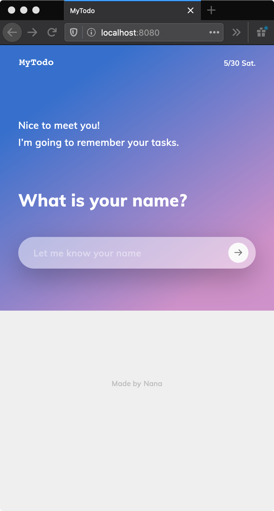 <!-- App.vue --> <template> <div id="app"> <TodoHeader /> <div v-if="userName"> <TodoTitle /> <TodoInput /> </div> <div v-else> <TodoHello /> </div> </div> </template> <script> export default { data() { return { userName: '' }; }, created() { this.userName = localStorage.getItem("userName"); if (localStorage.length > 0) { for (let i = 0; i < localStorage.length; i++) { if (localStorage.key(i) !== "userName") { this.todoItems.push( JSON.parse(localStorage.getItem(localStorage.key(i))) ); } } } }, //... } </script>TodoHello에서는 사용자 이름을 물어봅니다.