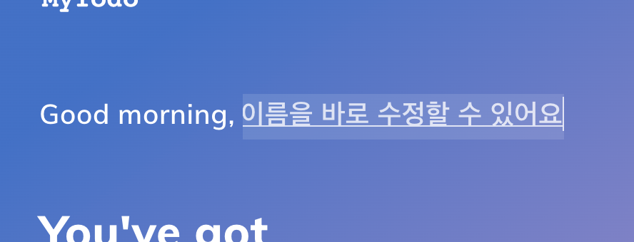 <!-- TodoTitle.vue --> <template> <div class="title"> <p class="title__text"> <span class="title__message">{{ message }},</span> <span v-on:keyup.enter="handleName" v-on:blur="handleBlur" class="title__name" ref="test" contenteditable="true" >{{ propName }}</span> </p> <!-- ... --> </div> </template> <script> export default { props: ["propCount", "propName"], data() { return { message: "Good morning" }; }, methods: { handleBlur(e) { const originalName = this.propName; const newName = e.target.innerText; if (newName !== originalName) { if (newName === "") { e.target.innerText = originalName; } else { this.$emit("changeName", newName); } } }, handleName() { this.$refs.test.blur(); } } }; </script>시간대에 따른 인사말 보여주기