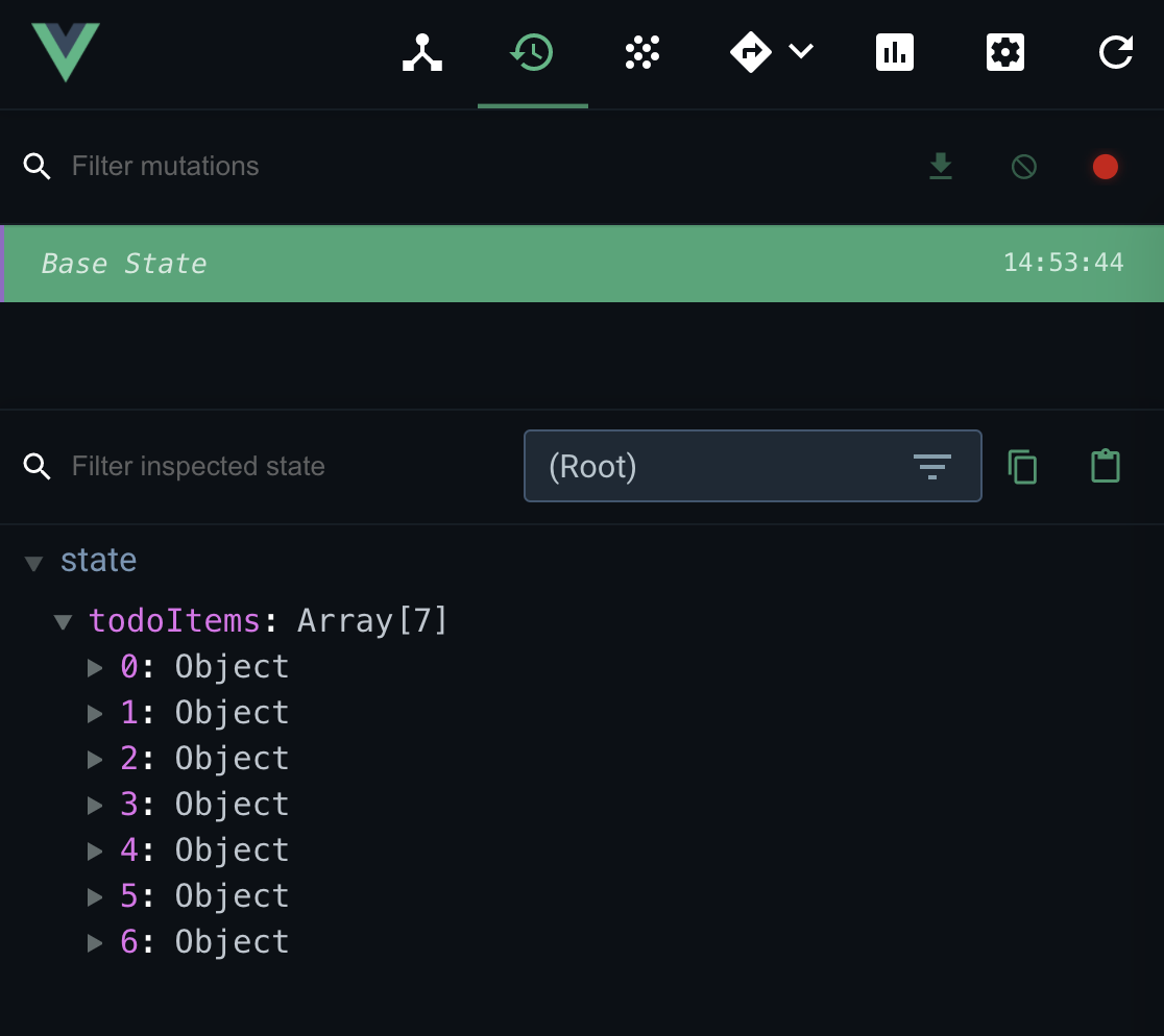 commit()으로 실행합니다.// store.js state: { myNum : 1 }, mutations: { addNum(state, payload) { return state.myNum += payload.num; } } // App.vue this.$store.commit('addNum', { str: 'Go!', num: 50 });기존의 todoItems를 state로 옮겼으니, 기존의 todoItems를 건드는 메서드들도 mutations로 옮겨야 합니다.