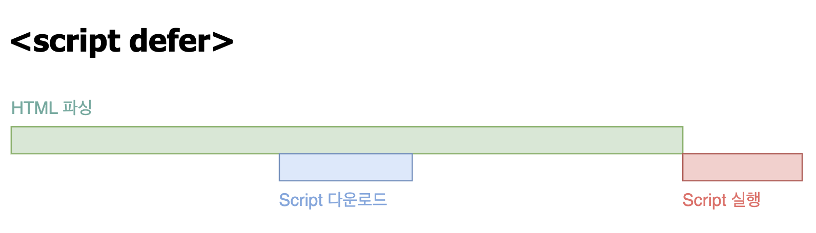 defer는 HTML 파싱 중에 파일을 다운로드하고 파싱이 완료된 후, DOMContentLoaded 이벤트 이전에 실행됩니다. 스크립트는 문서에 표시된 순서대로 실행되도록 보장됩니다.