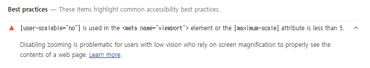 minimum-scale과maximum-scale도 1.0으로 지정했기 때문에 고정된 UI를 항시 보여줄 수가 있습니다.다만, 이 경우엔 웹 접근성 관련해 경고 카드를 받을 수도 있어요.
