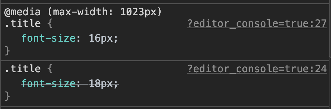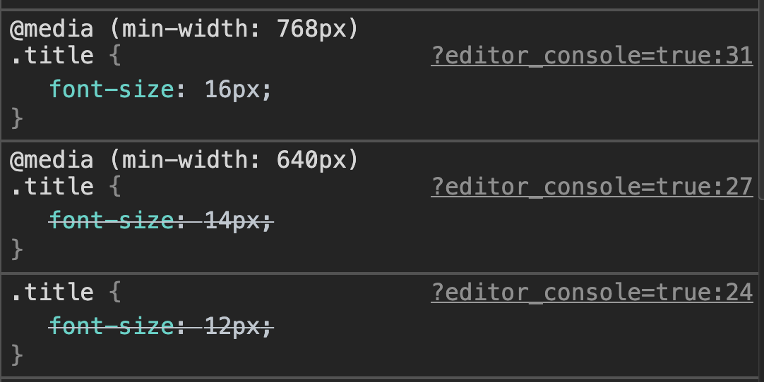 /* 컴파일 후 중복되는 미디어 쿼리 구문 */ .title { font-size: 12px; } @media (min-width: 1020px) { .title { font-size: 14px; } } @media (min-width: 1600px) { .title { font-size: 16px; } } .logo { width: 20px; } @media (min-width: 1020px) { .logo { width: 30px; } } @media (min-width: 1600px) { .logo { width: 40px; } }성능에 큰 영향을 줄 만한 요소는 아닌 것 같지만, 이왕이면 짧은 CSS가 좋겠죠.