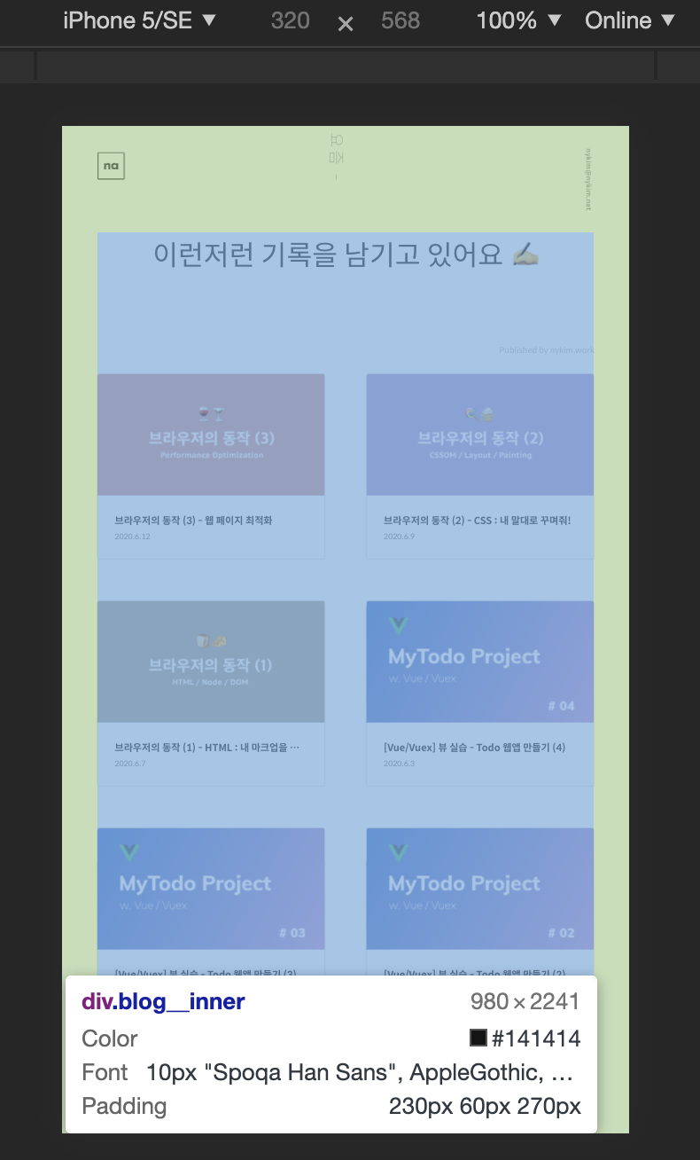 스크롤 앵커링: 더보기 버튼이 이상했'었'던 이유 (overflow-anchor) (11) 2020.11.22 반응형 웹 뚝딱 만들기 (2) - vw, vh, vmin, vmax, em, rem 속성 (39) 2020.08.23 [CSS] 이미지 사이즈 맞추기 (object-fit, absolute, background) (11) 2020.07.18 [CSS 방법론] BEM 방식 (31) 2020.05.17 [CSS] CSS Grid (그리드) 배우기 (12) 2020.01.29 댓글