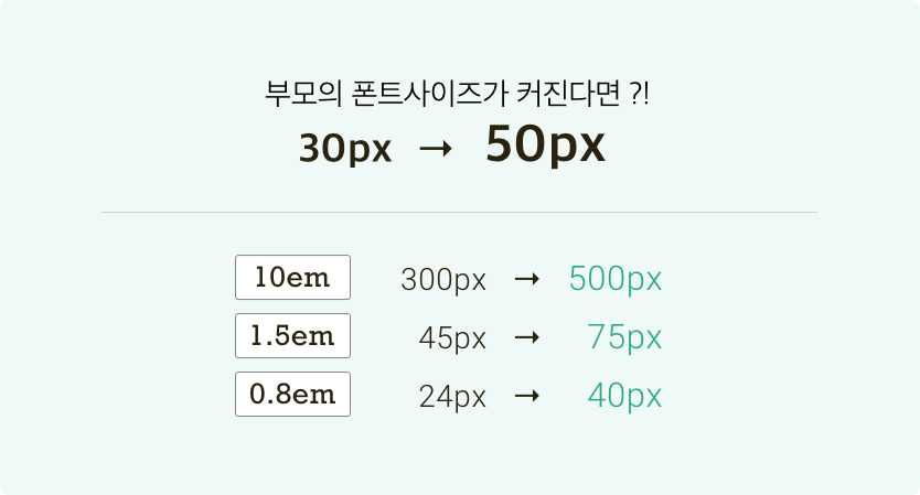 1em = 20px이 되고, 5em = 100px으로 커지게 됩니다.즉, 부모의 폰트 크기를 키우면 자식 요소의 크기도 덩달아 커지게끔 할 수 있다는 뜻이죠!