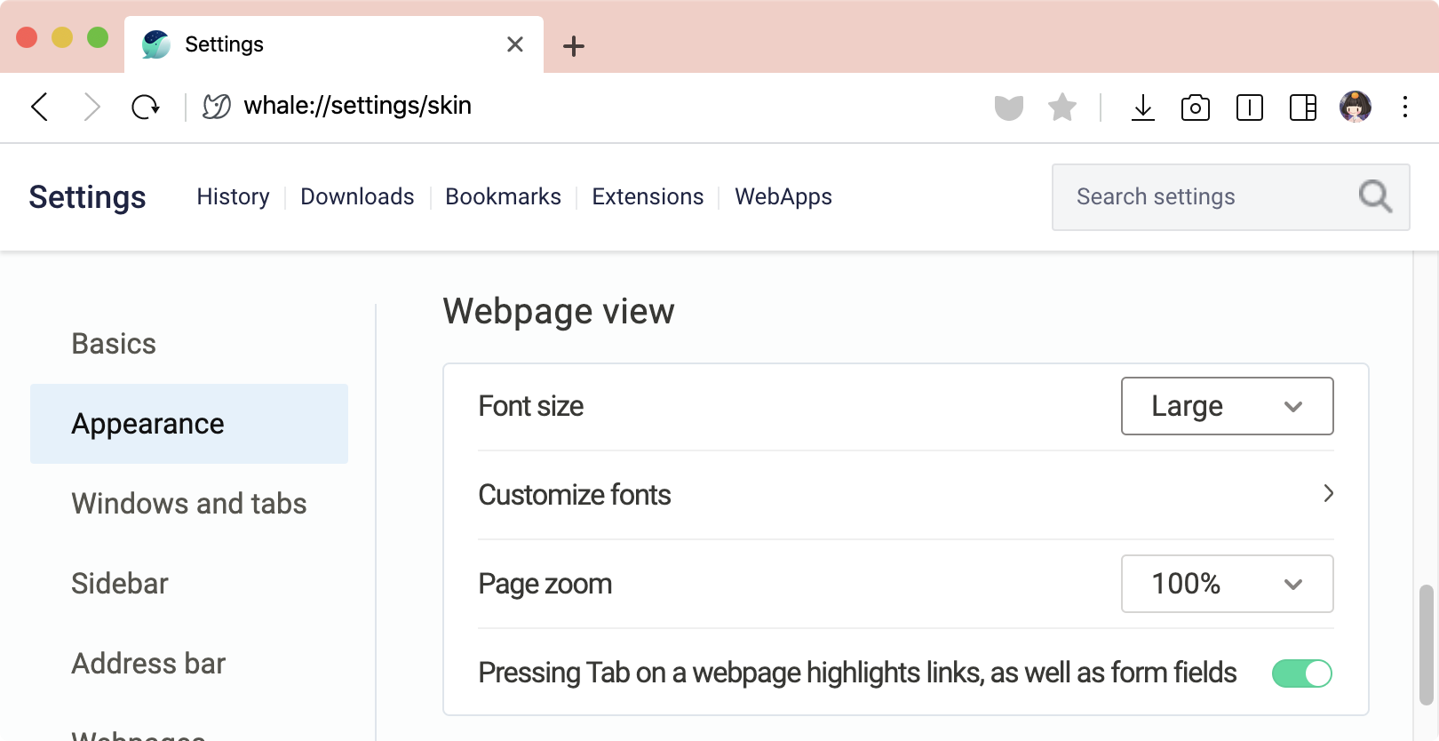 작은 글씨가 불편한 사용자는 웹 브라우저 설정에서 '폰트 기본 사이즈: 크게'와 같이 지정할 수 있어요.