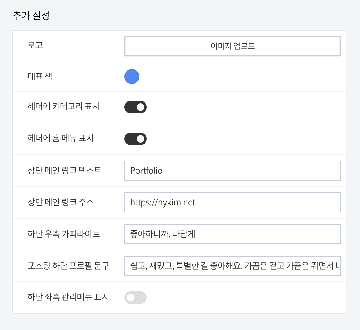 ⑤ 포스팅 하단 프로필 문구: 포스팅 하단에 보여지는 프로필의 문구를 수정합니다. 값이 없으면 프로필은 표시되지 않습니다.