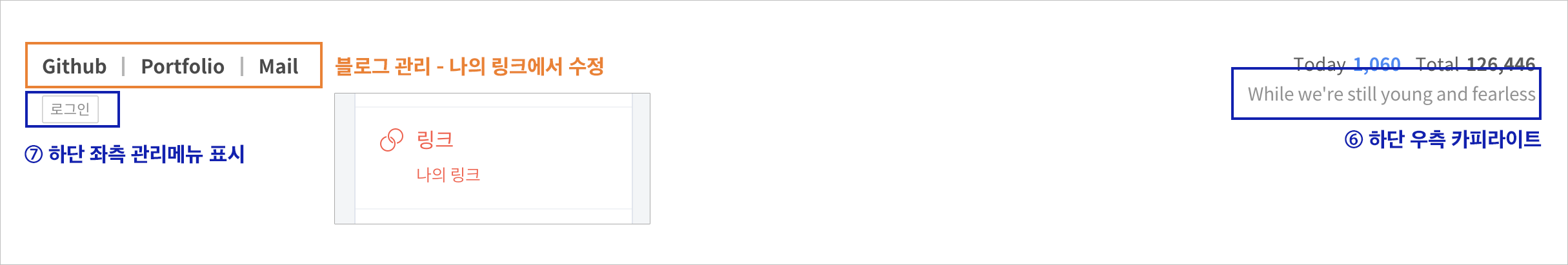 ⑦ 하단 좌측 관리메뉴 표시: 하단에 로그인/글쓰기와 같은 관리 메뉴를 추가합니다. 단, 티스토리 정책에 따라 2차 도메인을 사용 중이라면 동작하지 않습니다.