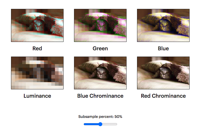 그래서 사람이 민감하게 반응하는 밝기 정보(Y)는 냅두고 색차(Cb, Cr) 정보를 줄여 압축하는 것을 서브샘플링이라 합니다.색차(Chrominance)는 줄여서 크로마라고 부르기 때문에 크로마 서브샘플링이라고도 하며, 다운샘플링이라 불리기도 합니다.