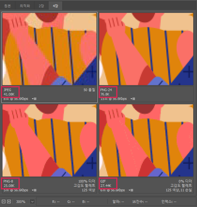 125색상을 쓰는 PNG-8과 GIF로 저장했을 때 용량은 어떻게 나올까요?