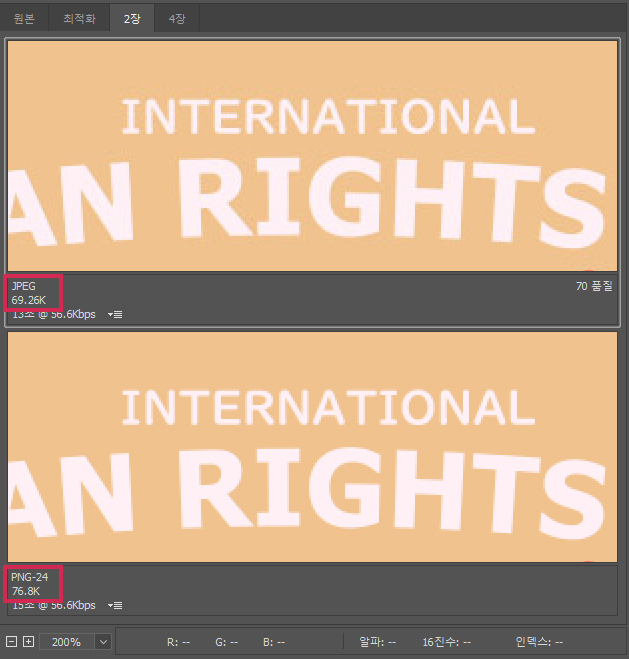 용량이 작은 순대로 나열하면 PNG-8 > GIF > PNG-24 > JPEG이 됩니다.