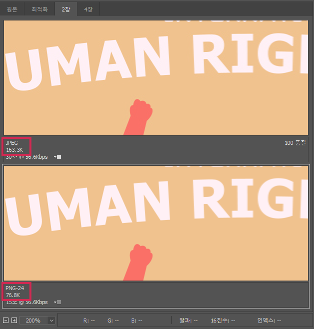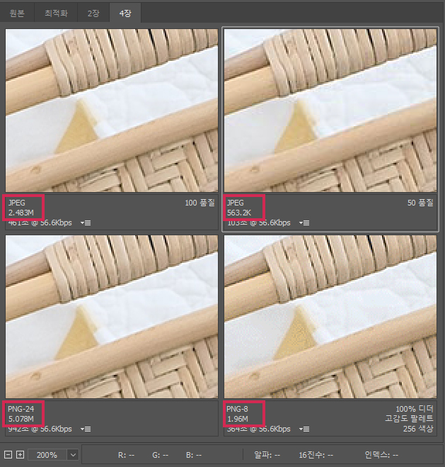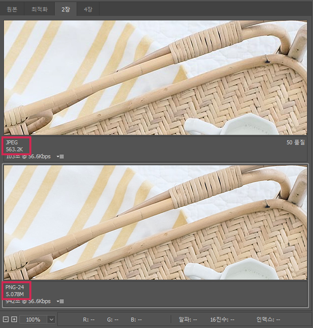 JPEG(50품질, 서브샘플링 적용) > JPEG(100품질) > PNG-8 > PNG-24 순대로 용량이 작습니다.이걸로 사진은 역시 JPEG 포맷이 어울린다는 걸 알았네요.