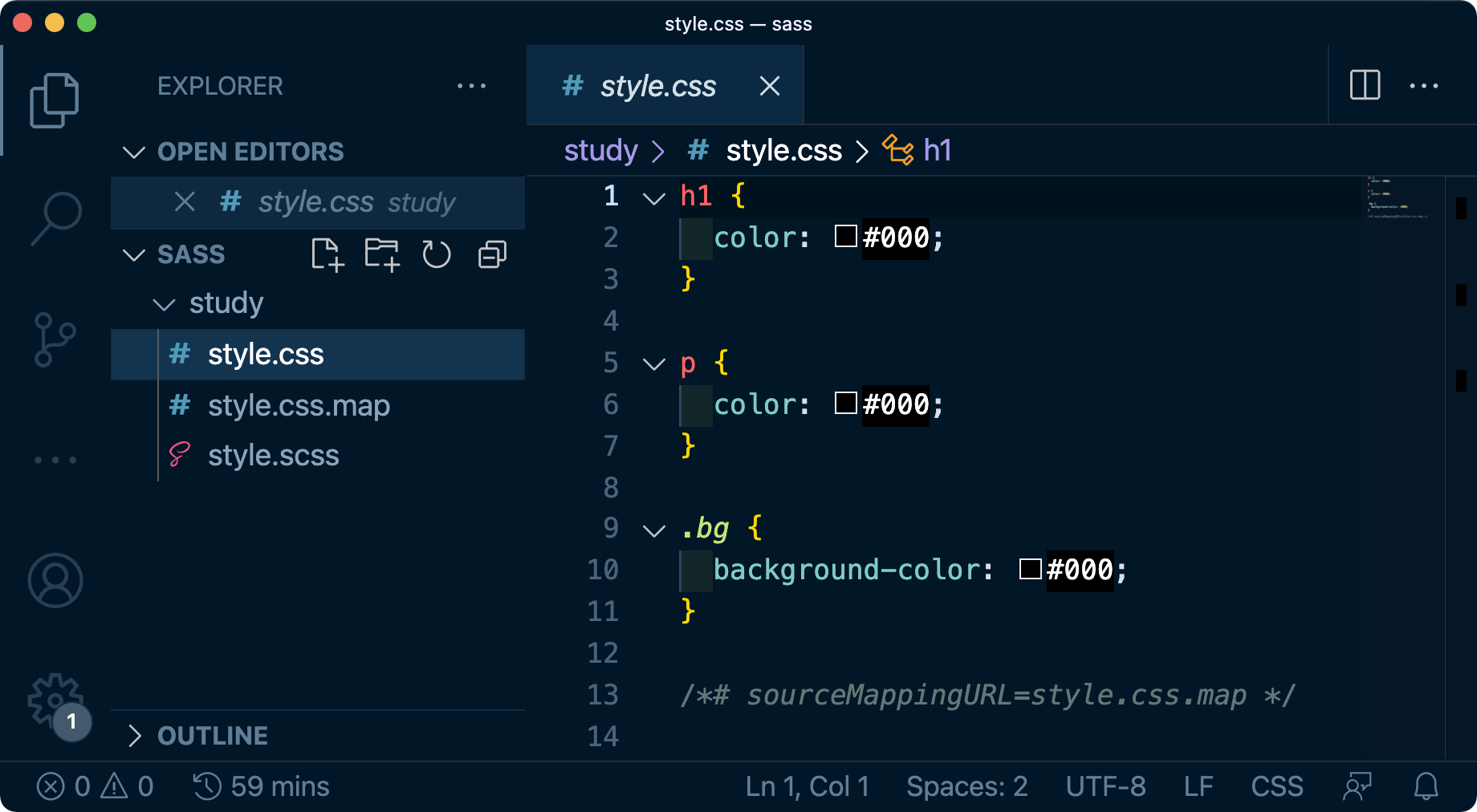이번엔 .bg { background-color: $color; } 를 추가하고 $color 변수의 값을 #000으로 바꿔봅니다.$color: #000; h1 { color: $color; } p { color: $color; } .bg { background-color: $color; }