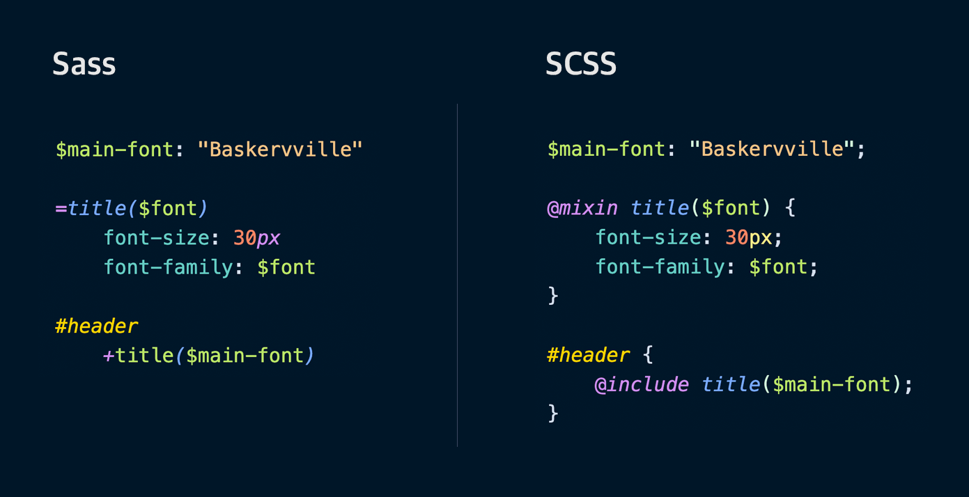 보면 Sass는 좀 더 깔끔하고, SCSS는 기존의 CSS 작성 방식과 유사하죠.