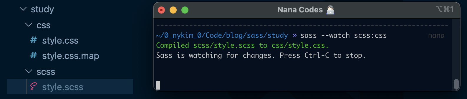 그럴 때는 `--watch`라는 플래그를 넣어 Sass가 해당 파일을 감시하게 만들 수 있습니다. style.scss에 변화가 생기면 알아서 컴파일하게끔 말이죠!sass --watch style.scss style.css