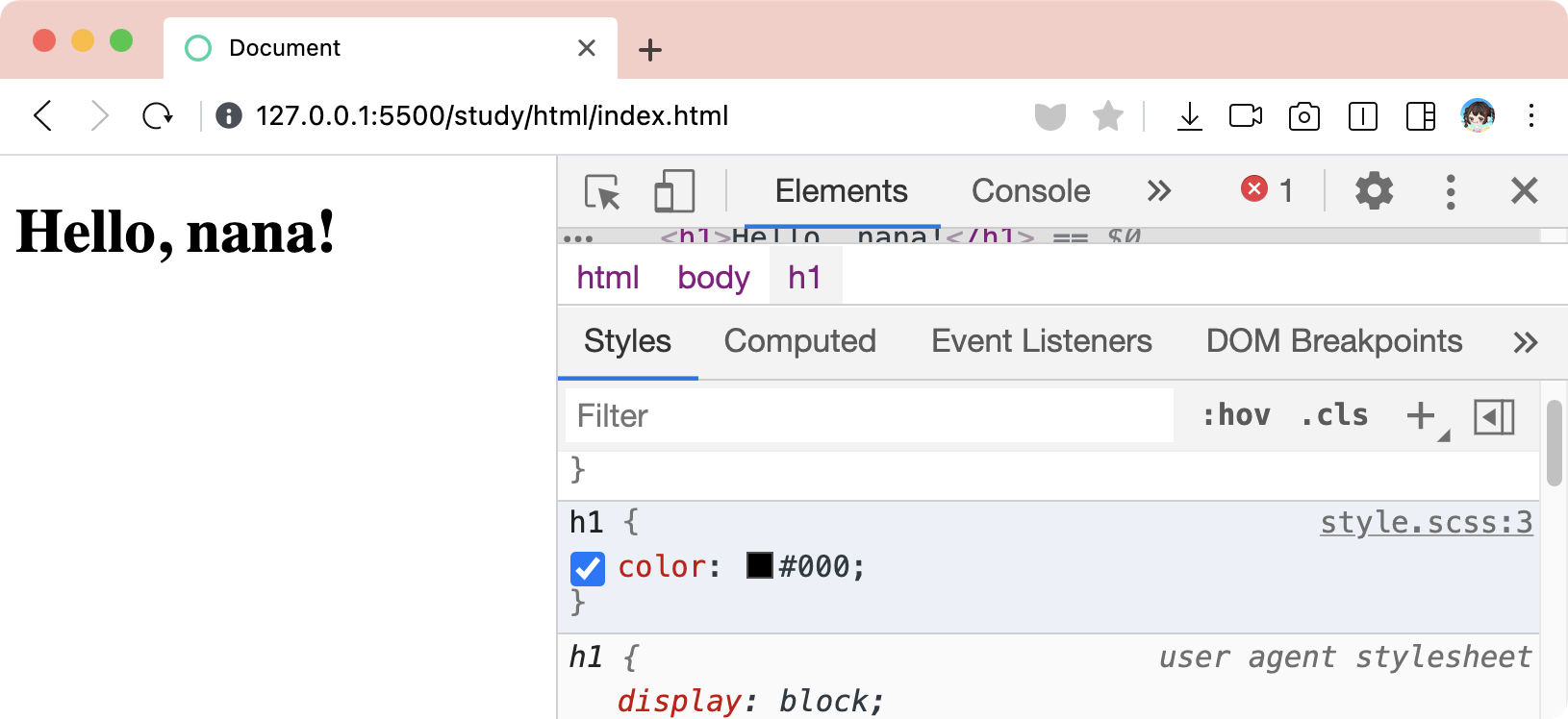 h1과 p의 color 속성값으로 red 가 들어갈 거 같은 느낌적인 느낌!진짜 그렇게 바뀌는지 확인해 보죠 🔍