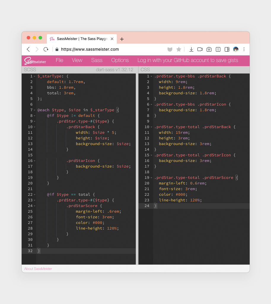 변수뿐만 아니라@for(반복문),@if(조건문) 같은 흐름 제어문이나 내장함수 등 다양한 문법들을 사용할 수 있어요.$_starType: ( default: 1.7rem, bbs: 1.8rem, total: 3rem ); @each $type, $size in $_starType { @if $type != default { .prdStar.type-#{$type} { .prdStarBack { width: $size * 5; height: $size; background-size: $size; } .prdStarIcon { background-size: $size; } } } @if $type == total { .prdStar.type-#{$type} { .prdStarScore { margin-left: .6rem; font-size: 3rem; font-weight: $mediumWeight; color: #000; line-height: 120%; } } } }평범하게 CSS 파일을 작성한다면 전혀 쓸 수 없었던 것을 Sass 문법을 통해 구현할 수 있게 되는 거죠.